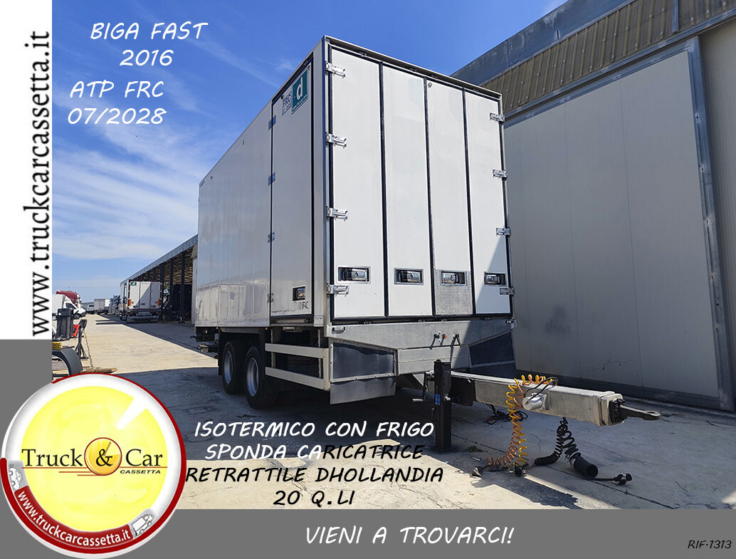 RIF.1313 RIMORCHIO BIGA FAST – 2016 – FURGONE ISOTERMICO CON GRUPPO FRIGO E SPONDA RETRATTILE DHOLLANDIA DA 20 Q.LI – ATP FRC 07/2028